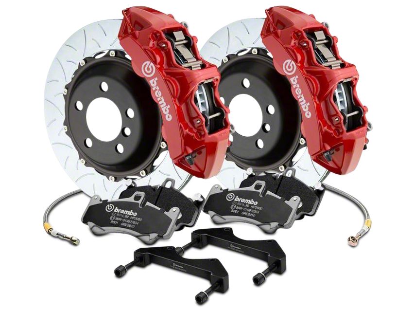 Ultimate Construction. The heart of this kit is in the 15" cast iron rotors. They are cast in two pieces. That separation accommodates different thermal expansion rates between the disc and the hat, thus preventing binding, cracking, and warping. The massive cast aluminum calipers feature a total of six pistons each, for a great grab on that iron surface. The calipers have Brembo's famous red finish for a sharp look.