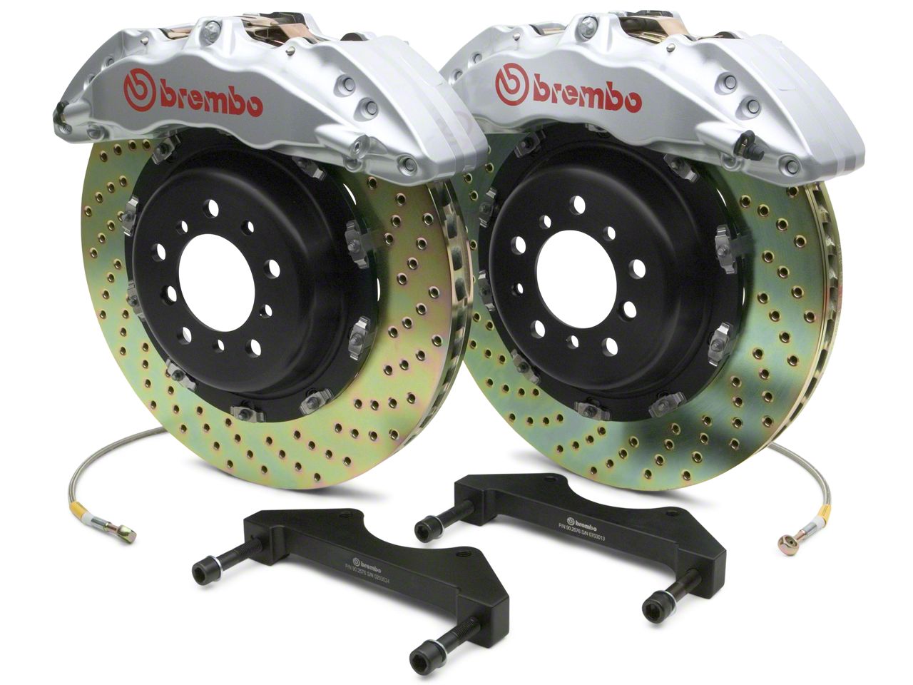 Formidable in Style. The aluminum 6-piston calipers give the Brembo GT Series 6-Piston Front Brake Kit with 2-Piece Cross Drilled Rotors in Silver a firm aesthetic style.