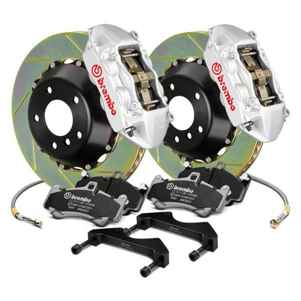 Slotted Brake Rotors. This GT Series 4-Piston Rear Big Brake Kit includes 2-Piece Slotted Rotors featuring Brembo’s quality metallurgy and engineering. The premium, advanced high-carbon alloy construction guarantees maximum heat dissipation and optimum brake torque. The 2-piece discs are particularly designed to prevent gas build-up and provide exits for water and debris, thereby continually cleaning the pad surface.