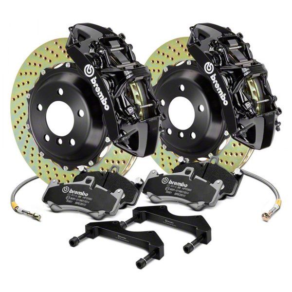 Remarkable and Functional. The Brembo GT Series 6-Piston Front Big Brake Kit, which boosts brake torque and heat dissipation while lowering unsprung weight, is a large, lightweight, 2-piece floating cross-drilled brake disc. Comparable high-performance and racing discs' lifespans are significantly less than that of cast iron discs. It's because they're constructed from a unique cast iron alloy. In order to improve ventilation, remove water, prevent gas buildup, and debris, and regularly clean and renew the pad surface, these rotors are drilled.