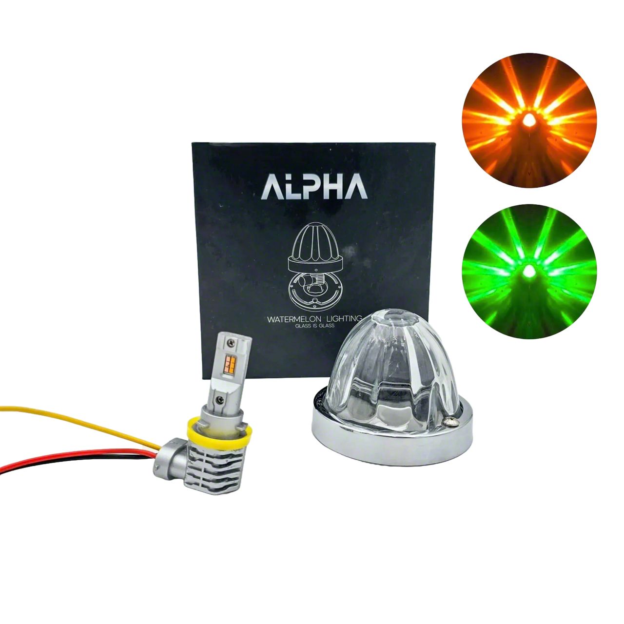 Customizable and Dynamic Lighting. The BTS Lighting Alpha Series Glass Dual-Color LED Star Watermelon Light offers a high-performance, customizable lighting solution for trucks and custom vehicles. Featuring a true glass star-patterned lens, it provides clear, fade-resistant light projection for maximum visibility and visual appeal. The dual-color functionality lets you switch between amber for visibility and green for utility or show use, offering versatility for different needs.