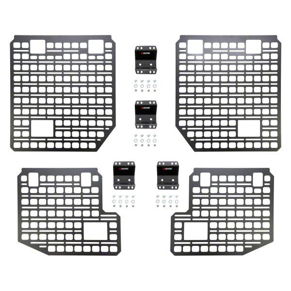 Construction and Appearance. Crafted in the USA, this Molle rack system features a durable matte black finish that resists scratches and wear. Built to use stock mounting points, this 4-piece kit is made from high-quality materials that withstand the rigors of heavy use. The rugged look and finish complement the truck's aesthetic while providing a practical and organized storage solution.