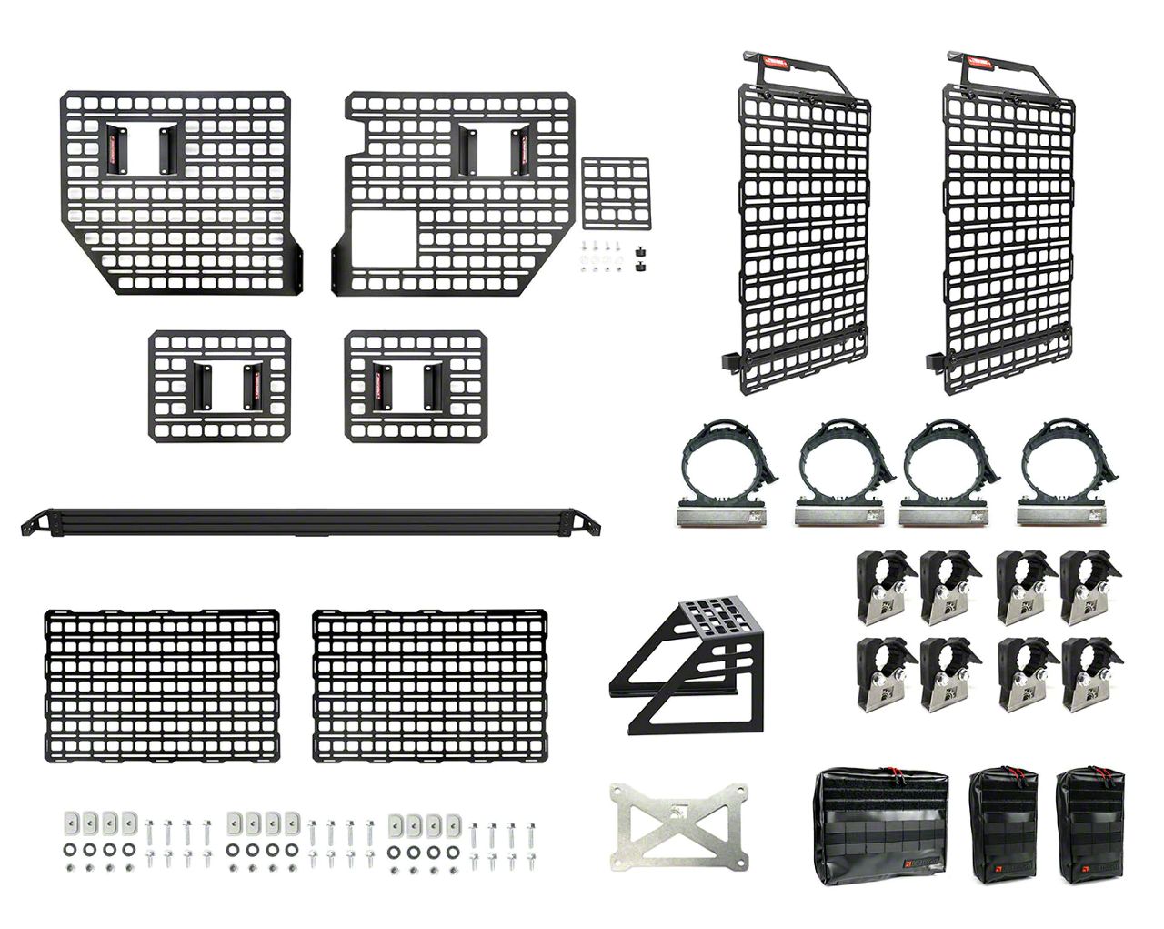 Pro Kit. Made for the Ford F-350 Super Duty with SYNC4, this BuiltRight Industries Gear Organization MOLLE System comes in a matte black finish. Built as a Pro kit, this system includes a full MOLLE panel system with Back MOLLE panels and Super Clamp Riser mounts. Crafted in the USA for easy installation, this system lets you organize and secure your equipment including shovels, axes, and fire extinguishers while remaining easy to access.