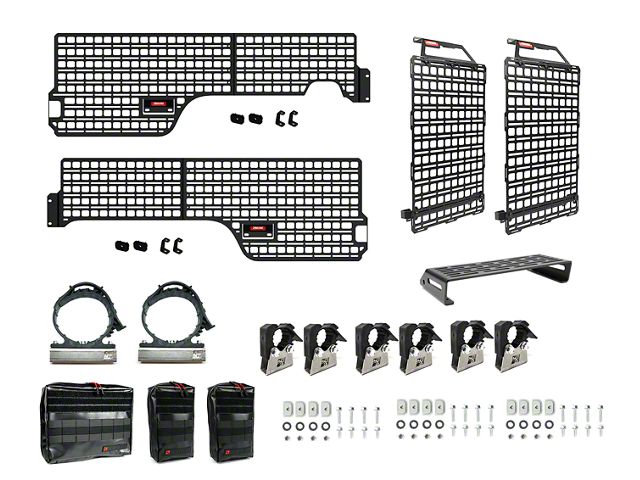 This kit includes a full set of Bedside Rack System MOLLE panels and a pair of Rigid Seat Back MOLLE Panels along with the most commonly used attachments. In addition, The Original Riser Mounts are perfect for mounting two implements - shovel, axe, jack handle, etc. The Super Clamp Riser Mounts are great for a fire extinguisher, recovery strap, tie down straps, etc. The MOLLE nuts will ensure that installation and configuration isn't a headache.