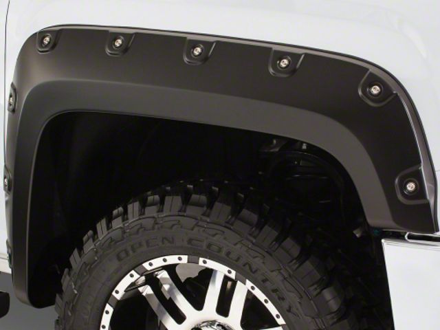 Functionality & Flair. Add an aggressive style to your GMC Sierra while protecting its fenders from rocks, mud, and other trail-borne debris. The Bushwhacker Boss Pocket Style Front and Rear Fender Flares in Matte Black. Pocket flares add durability, flexibility, and two inches of additional tire coverage to your Sierra 1500 at an affordable price.