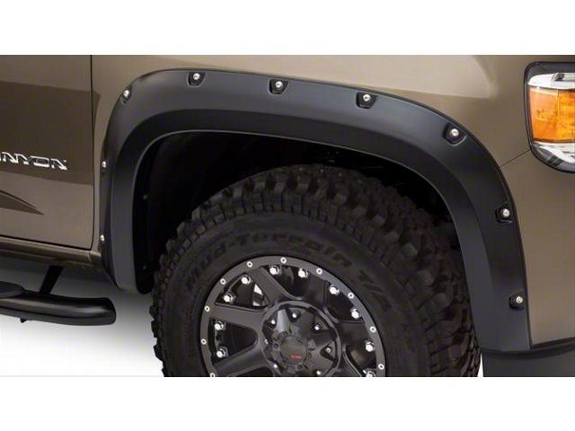 Perfectly Combined Features. Enhance the rugged look and functionality of your Canyon with Bushwacker's Pocket Style Fender Flares. These fender flares offer a perfect combination of style, durability, and protection for your vehicle. With their unique pocket-style design, these fender flares add a distinctive and aggressive look to your vehicle. The matte black finish, which is paintable, allows you to customize them to match or contrast with your vehicle's color scheme.