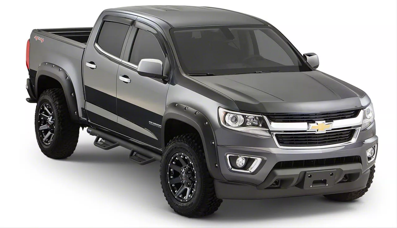Rough and Tough Upgrade. Add character to your Colorado with the Bushwacker Pocket Style Fender Flares for Front and Rear in Matte Black. This set of 4 fender flares in pocket/rivet style features sunken bolts, giving your truck a tough and imposing aura that’s ready to conquer the off-roads. These fender flares complement your large tires and also offer maximum coverage and protection against dust and debris.