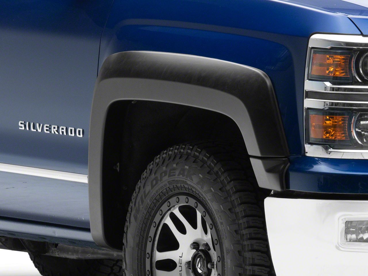Application. These Bushwacker Rear Extend-A-Fender Flares - Matte Black fit all 2014-2018 Chevrolet Silverado 1500 models, excluding Crew Cab w/ Short Box.