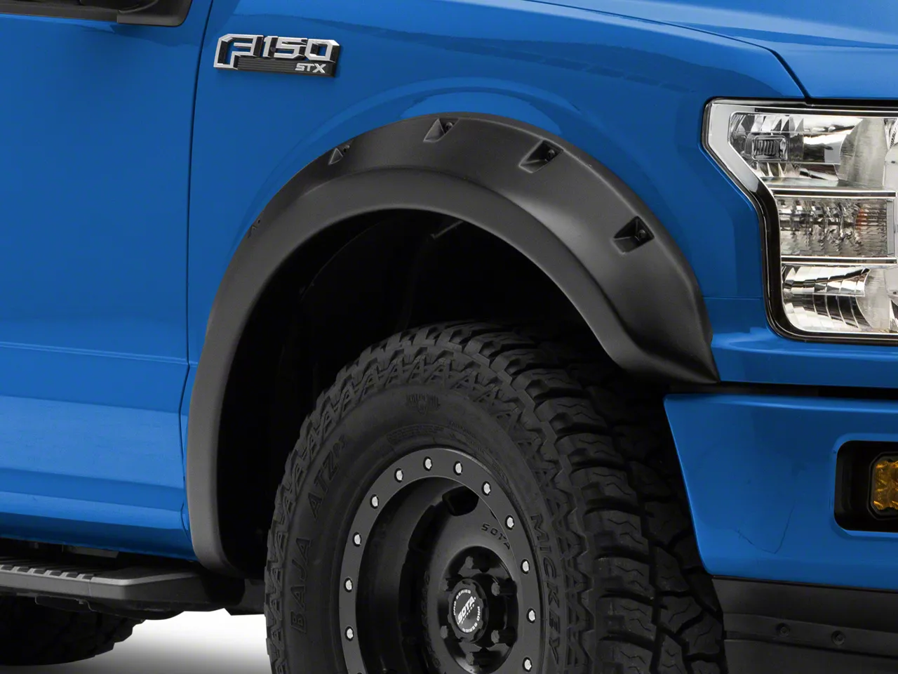Eye-Catching Styling and Protection. The rugged appeal of these Bushwacker Forge Style Fender Flares; Front and Rear; Textured Black brings out the aggressive nature of your Ford truck. Their riveted styling makes your vehicle look even more impressive than ever. Additionally, these fender flares’ aggressive features provide maximum tire coverage, allowing you to conquer rough roads without fear of causing damage to your truck’s lower body.