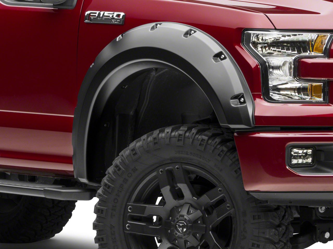 Coverage and Protection. Upgrading to larger tires can easily extend tire tread past your F-150's fenders and well outside local laws. Get the coverage you need with the Bushwacker Max Coverage Pocket Style Flares. These Fender Flares will give your truck an aggressive, pocket look and add up to 2.75 inches of tire coverage for reliable coverage and protection. They're UV stable and feature an OEM matte black finish that can easily be painted for a custom appearance.