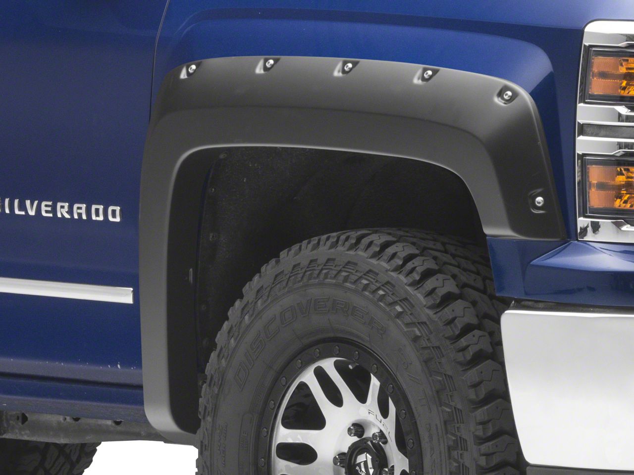 Protection and Performance. Add a tough look to your Silverado while imparting excellent protection against off-roading hazards with this Bushwacker Pocket Style Front and Rear Fender Flares in Matte Black. These 6.50-inch flares add 1.75-inch of tire coverage to accommodate oversized tires. They deflect rocks and other debris from your Silverado's body to ensure it stays in great shape.