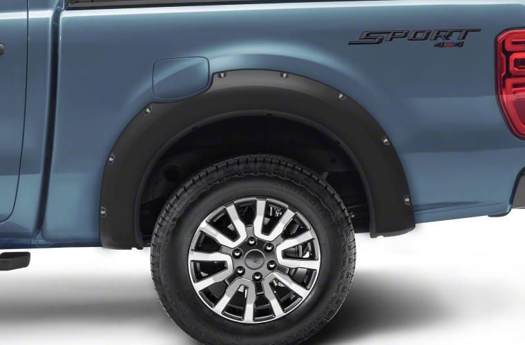 Robust and Stylish Protection. The Bushwacker Fender Flares offer robust protection and an aggressive look for your Ranger SuperCab. Featuring a rear pocket style model with a textured black finish and riveted design, these fender flares provide maximum tire coverage and a bold aesthetic.