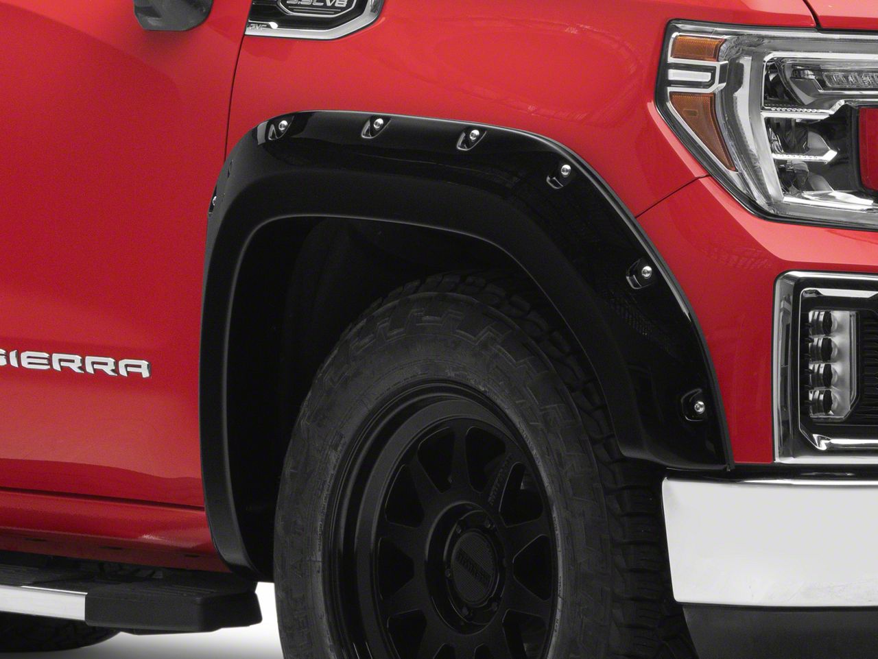 Bold Style Upgrade. Take your Sierra 1500 to a whole new level with the Bushwacker Pre-Painted Pocket Style Fender Flares. These pocket style fender flares feature simulated rivets along their top edges to give your truck a bold new style. Moreover, these flares are designed to extend outward, providing your fenders with added coverage. This added coverage provides extra side protection against thrown off debris which could potentially scratch your finish.
