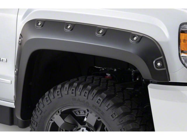 Fresh Vehicle Look. Are the fender flares on your Sierra 2500 damaged, broken, or lost? Freshen up your ride with these robust, reliable, and affordable Bushwacker Boss Pocket Style pieces. Achieve that off-road look, and rest assured that your Sierra’s engine will remain untouched when you take it for adventure. Get up to 2 Inches of additional clearance for your tire coverage with these fender flares. And keep the elements where they belong – on the outside.