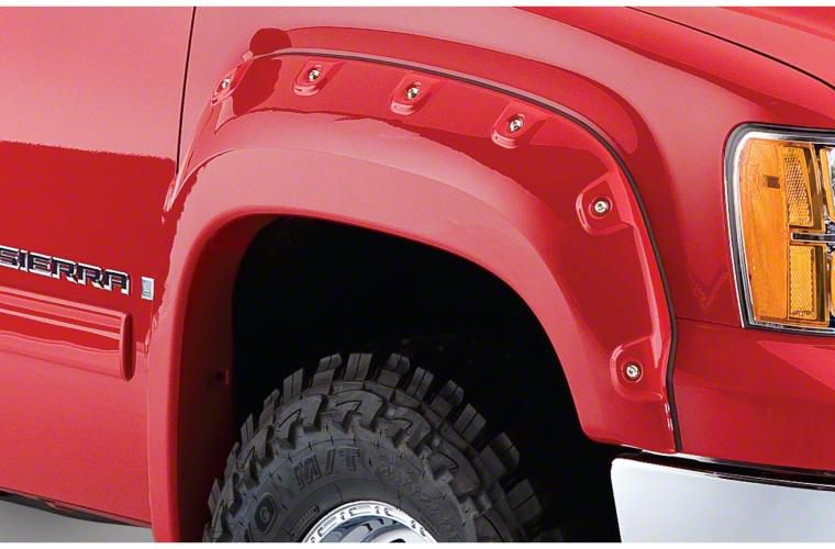 Aggressive Style. Revitalize your Sierra 2500 HD with the Bushwacker Cut-Out Fender Flares; Front; Matte Black. These flares not only add a striking aesthetic but also provide the extra clearance you need for larger tires and enhanced off-road adventures. Designed to accommodate larger tires, these flares grant you more room for aggressive off-road rubber.