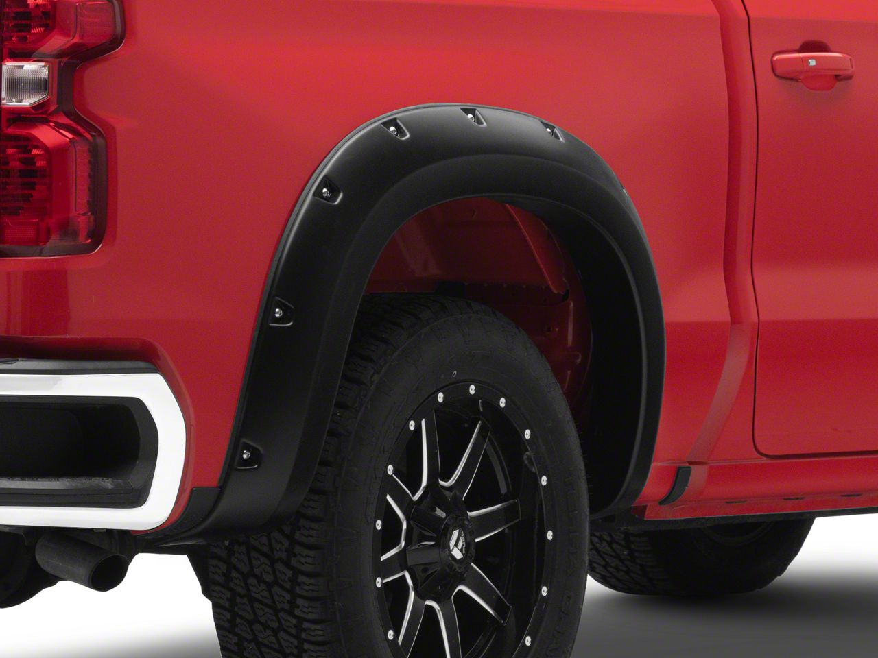 Fender Upgrade. Give your Silverado an aggressive new styling with the Bushwacker Pocket Style Fender Flares Rear in Matte Black. This pair of rear fender flares have a pocket-style design with a bolt-on look giving your ride an off-road-ready appearance. These flares also add up to 1.50-inch of tire coverage has been custom-molded to guarantee a perfect fit and long-lasting reliability.
