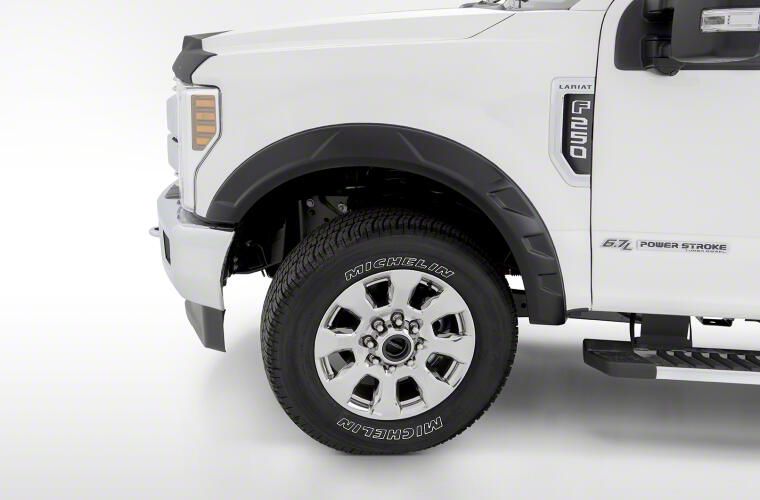 Application. This pair of Bushwacker DRT Style Fender Flares - Front in Matte Black is designed to fit 2017 to 2020 Ford F-250 Super Duty models.