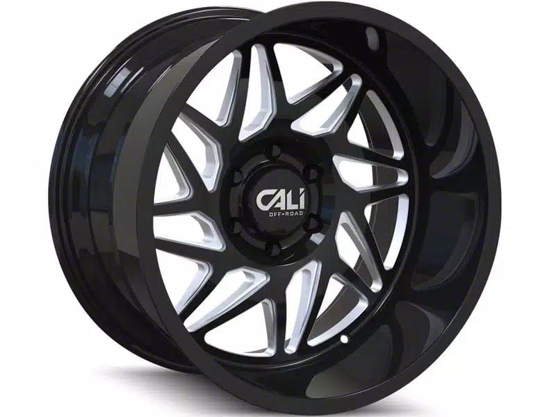 This 20x10 Cali Off-Road Gemini Gloss Black Milled 6-Lug Wheel is completed in a high-quality gloss black finish with steel milled accents that will create a striking appearance. There's a durable clear coat that protects against driving hazards.
