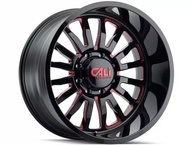 Cali Off-Road Summit Gloss Black with Red Milled Spokes 6-Lug Wheel; 20x10; -25mm Offset. The Cali Off-Road Summit Gloss Black with Red Milled Spokes 6-Lug Wheel offers a striking balance of style and refinement. Its unique design accentuates the vehicle's aesthetic, while the premium construction underscores its robust nature. This wheel is a perfect choice for those seeking both elegance and a strong visual statement.