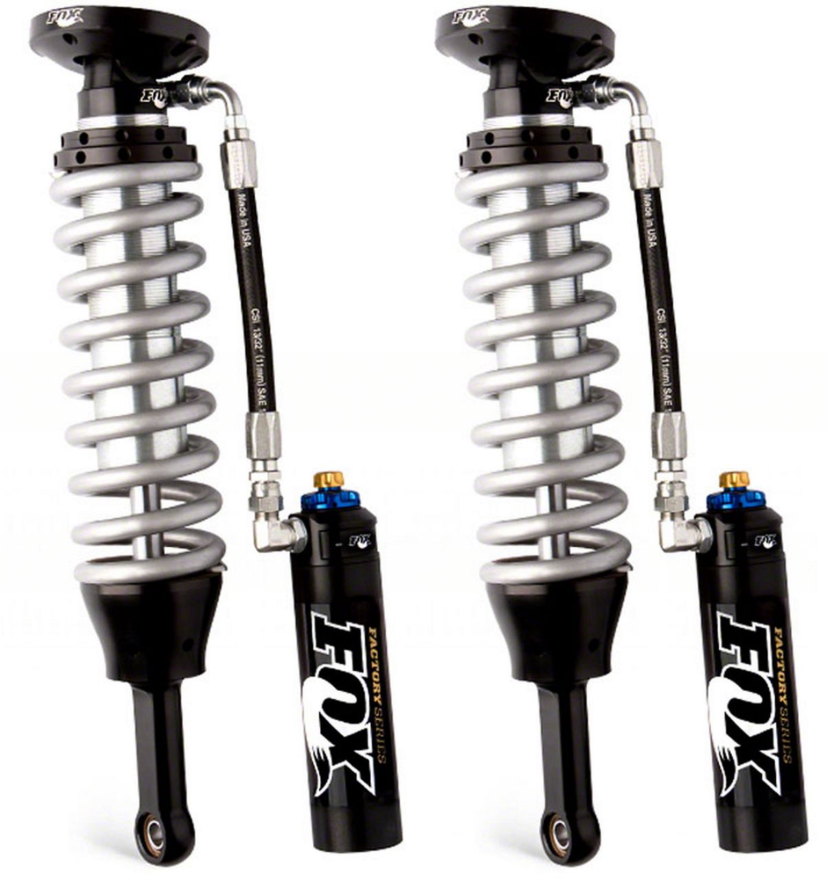 Upgrade your Chevrolet Colorado with the FOX 2.5 DSC coil-over kits for improved performance and style. These coil-overs allow for lifting and enhance ride quality on and off-road. They are designed to maximize wheel travel and maintain the working ranges of CV joints, tie rods, uni-balls, and ball-joints. With a 2.5" diameter shock body, they offer increased oil capacity for aggressive use. The coil-overs are fully rebuildable and revalveable for optional tuning and maintenance. The remote external reservoirs provide lower operating temperatures, while the Dual Speed Compression (DSC) adjuster allows for precise tuning with twelve low-speed and ten high-speed compression levels. The integrated coil spring is adjustable for preload and ride height, and the kit includes uniball upper arms to address limitations of stock upper arms. The uniball bearing increases wheel travel and durability under extreme conditions. The kit also includes FOX's 2.5 Factory DSC Series shocks for increased damping and control in the rear. Made in the USA, these shocks feature smooth bore and honed seamless alloy bodies, zinc-plated and double-clear coated finish, Eibach racing springs, hardened NitroSteel carbon shafts, high flow aluminum pistons, and PTFE-lined spherical bearings. Please note that this kit does not fit ZR2 models and trimming is necessary when running 32" tires.