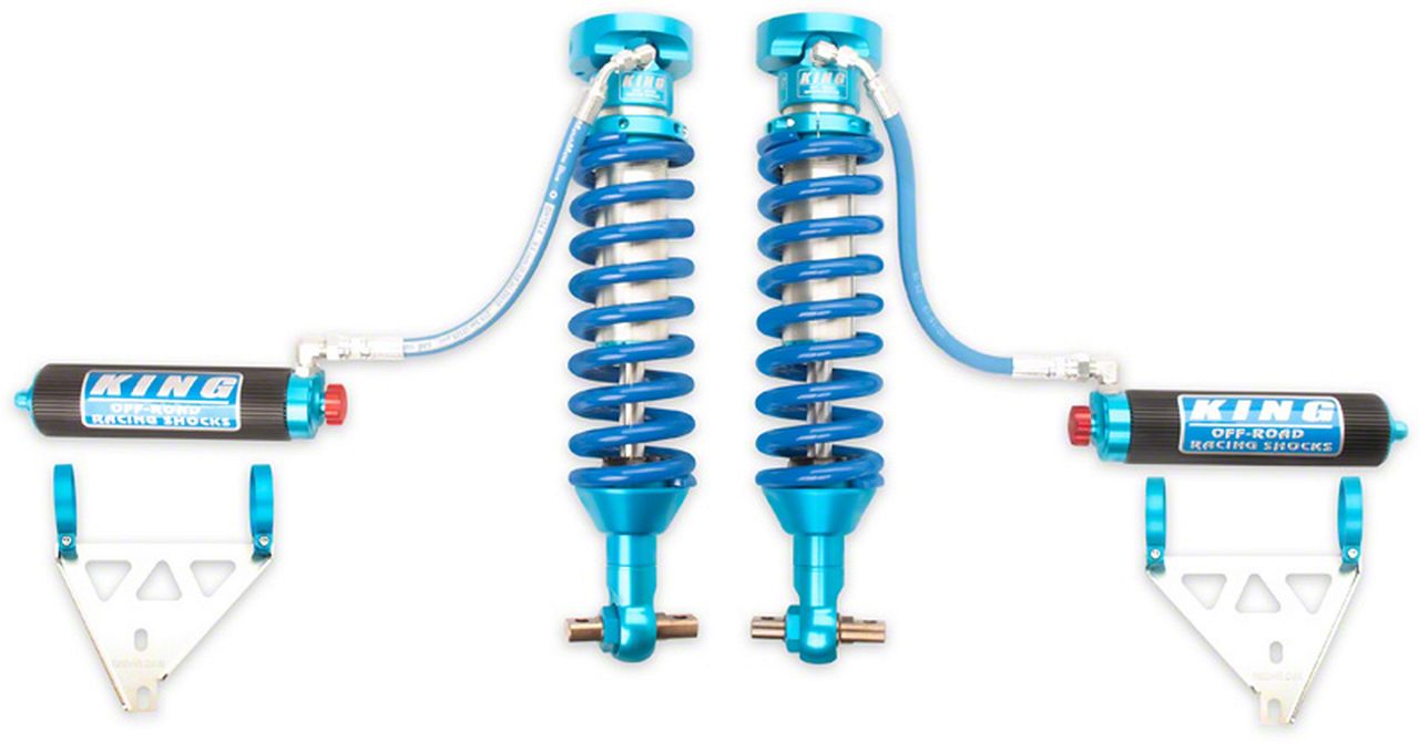 Introducing our King 2.5 Performance kit for the new Ford Ranger. This kit includes a cast steel knuckle/spindle, upper arms, and King's 2.5 series front coilovers with compression adjusters. It improves ride and handling on and off-road, increases wheel travel, corrects suspension geometry, and eliminates weak upper ball-joints. The kit also includes King's 2.5 remote res. shocks for the rear, offering increased oil capacity and control. Tremor models will see a lift of 1-1.5". Made in the USA. Available for US model trucks only.
