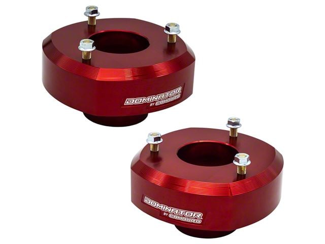 Construction and Features. Featuring a durable metallic red finish, the Camburg Dominator Series Spacer Kit is crafted to provide long-lasting reliability and a sleek appearance. The 2-inch preload coil spring spacers are precision-engineered to maintain proper suspension geometry while delivering enhanced ride height. Its rugged construction ensures it can handle the toughest driving conditions with ease.