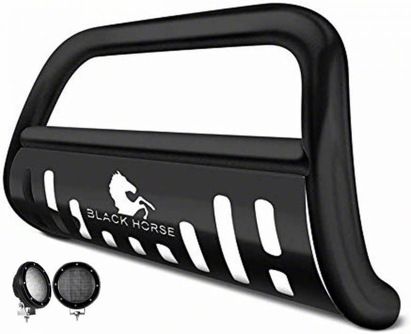 Construction and Appearance. This bull bar is crafted with a high-quality glossy black finish that ensures long-lasting durability and resistance to corrosion. Both the inside and outside are E-coated, providing an extra layer of protection against the elements. The removable skid plate offers additional protection and versatility, making it suitable for various driving conditions. The included two 5.30-inch glossy black finish round flood LED lights enhance visibility, making nighttime and off-road driving safer and more convenient.