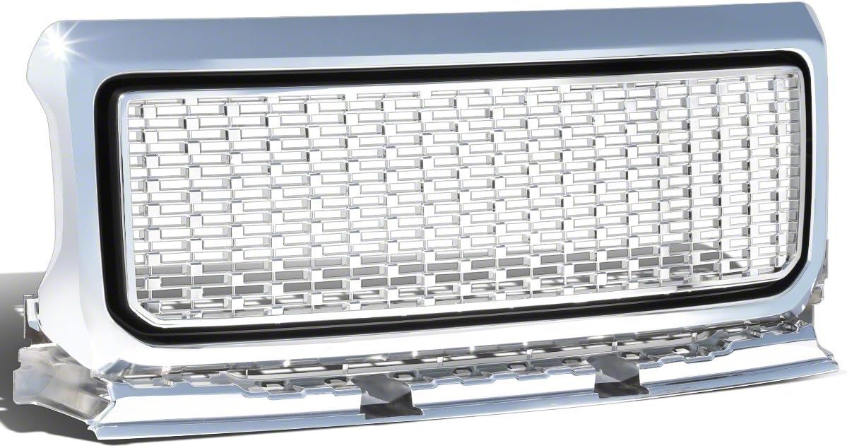 Construction and Appearance. Manufactured from high-quality materials, this grille features a diamond mesh style design for a modern, aggressive look. The chrome color with a polished finish provides a sleek, mirror-like shine that complements the factory design while adding a custom touch.