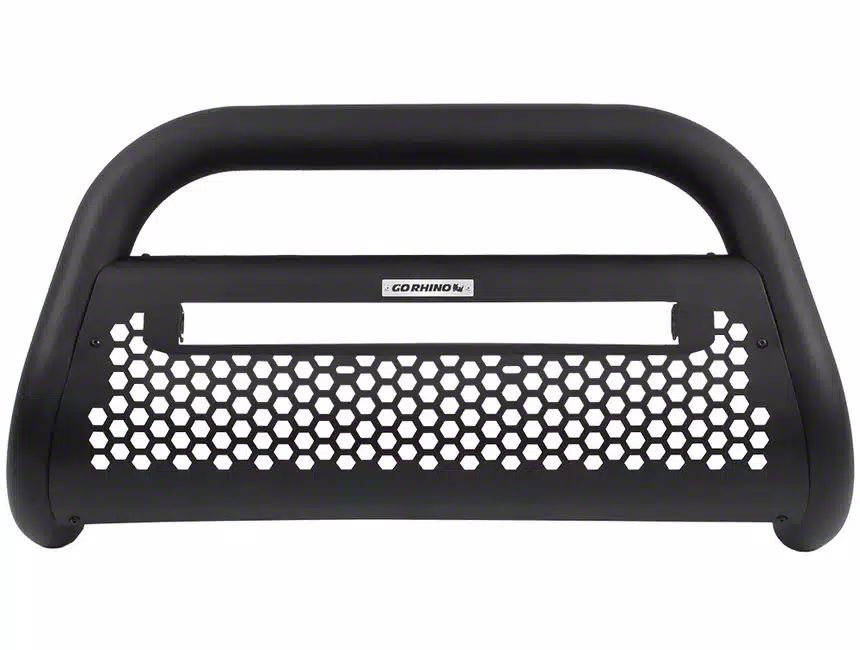 Construction and Appearance. Crafted from 3-inch tubular steel, this Go Rhino RC2 LR Bull Bar features a textured black finish that not only provides a sleek and aggressive appearance but also ensures durability against the elements. The hexagonal punched design skid plate adds an extra layer of protection and style, making your vehicle stand out.