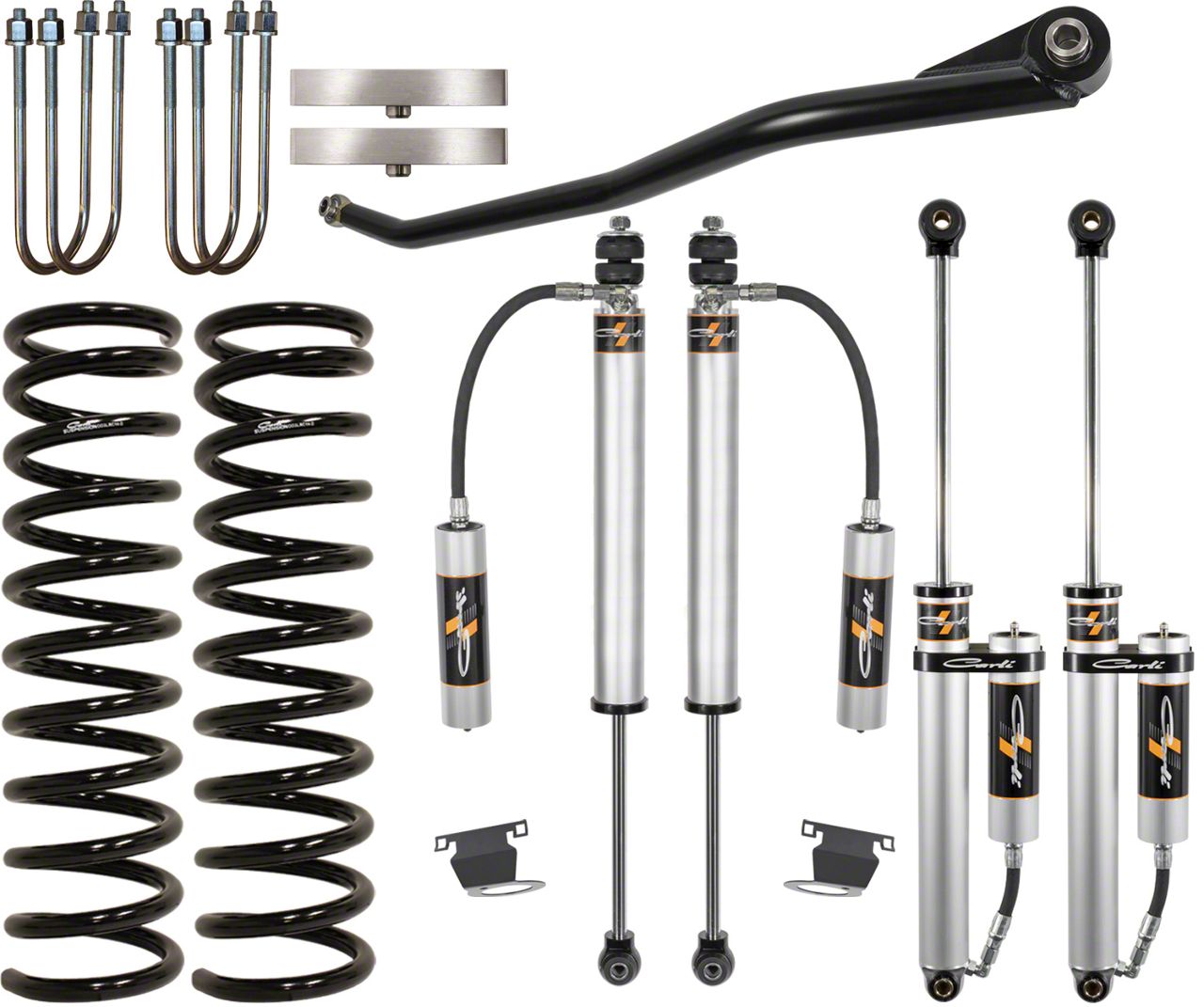 Premium Leveling Solution. The Carli Suspension 2.50-Inch Front Backcountry Leveling System with Carli SPEC 2.0 Remote Reservoir Shocks is engineered to elevate your truck's stance and performance. Furthermore, it provides enhanced off-road capability, improved ride quality, and better handling, ensuring superior performance in a variety of driving conditions.
