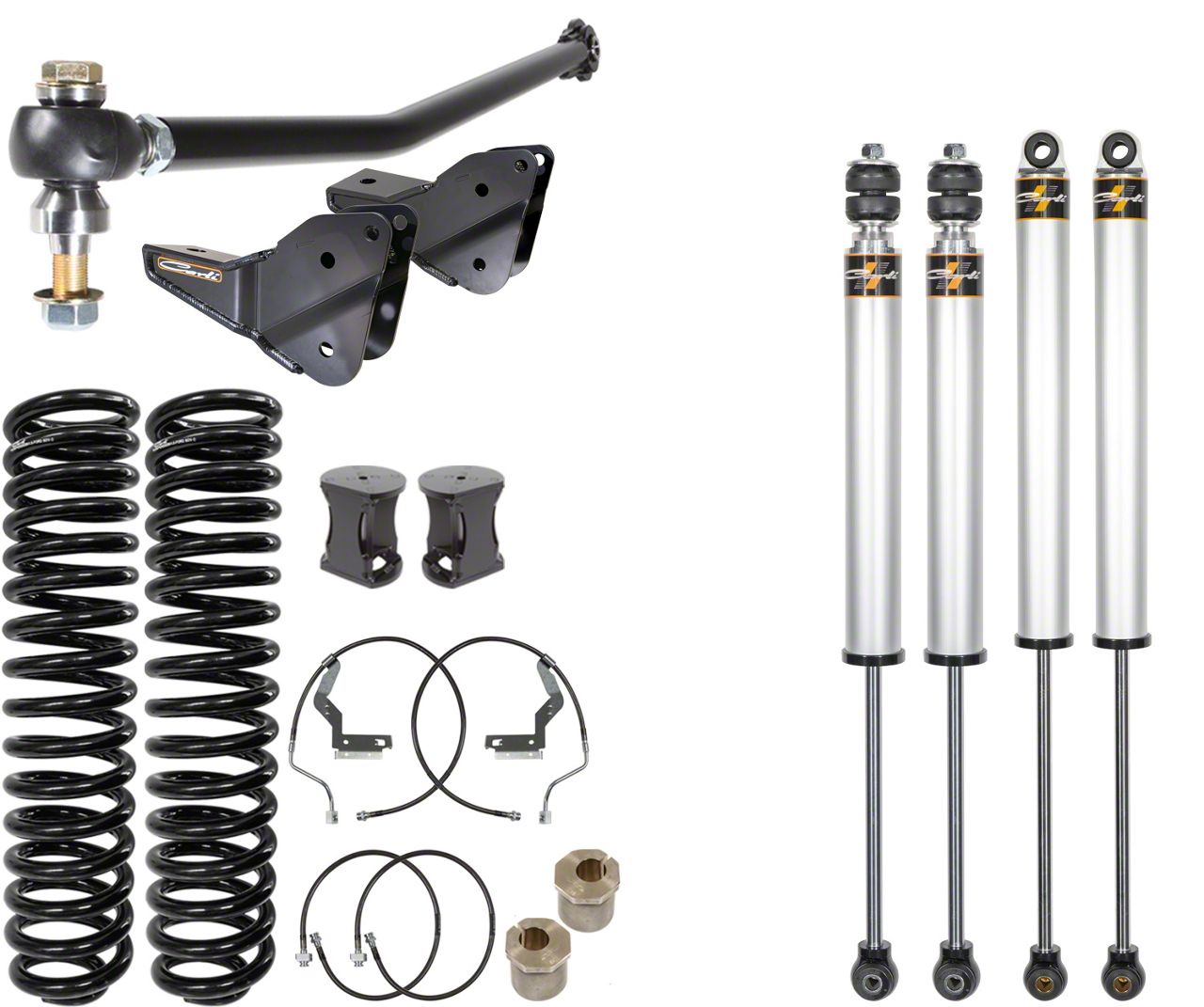 Construction and Features. This complete lift kit includes Carli SPEC 2.0 IFP shocks, durable coil springs, a track bar, caster shims, brake lines, bump stop drops, and radius arm drops. With a combination of glossy black, polished chrome, and matte black finishes, it offers a refined look alongside robust functionality. Note that this lift system is incompatible with vehicles equipped with stock scales or Smart Hitch features.
