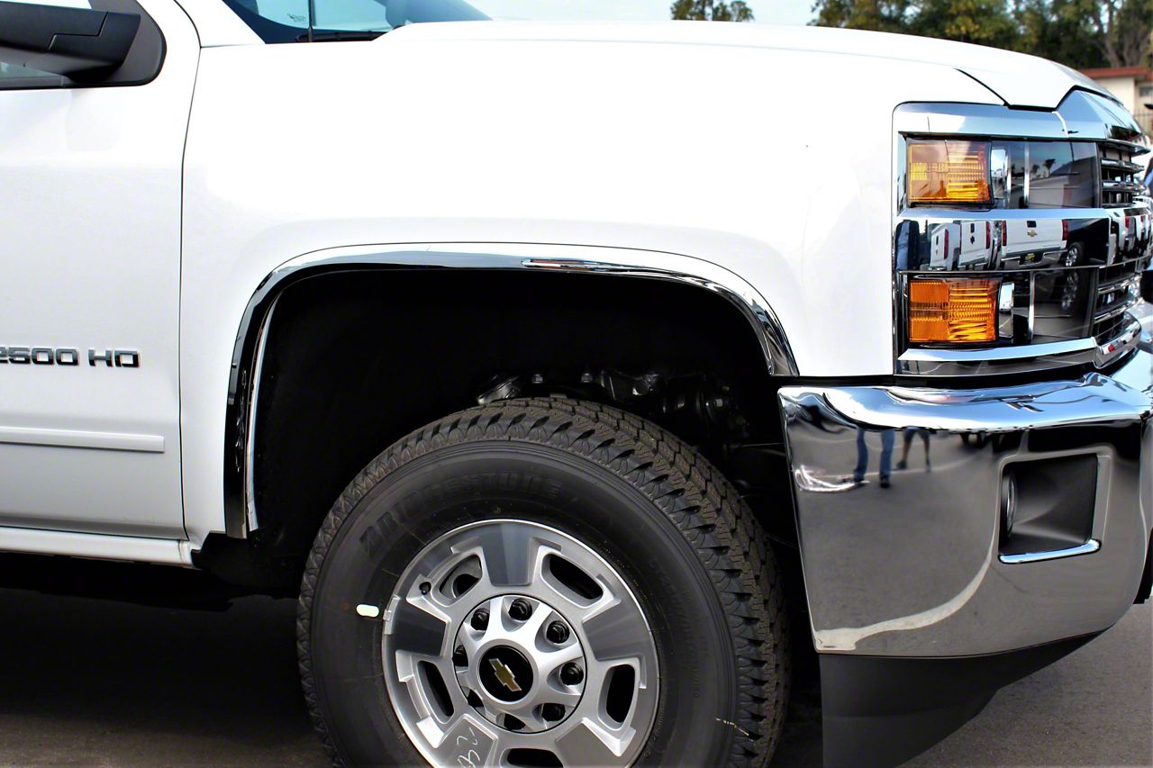 Sleek Fender Styling. If you're thinking of adding a bit of modern styling to your Silverado, the Stainless Steel Fender Trim (Polished) is an easy and affordable way to customize your truck. These fender trims that are sold as a set of 4 for an all-in-one upgrade for your tires are pre-programmed to follow the bend of your fenders. It is 1.57-inch in width with full fender length on the rear and 3/4 on the front. This custom look will most definitely add a sleek modern appeal to your truck.