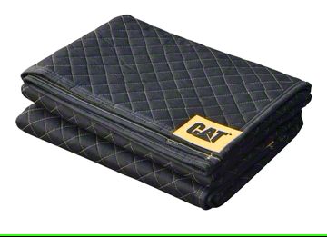 Construction and Appearance. This utility blanket features a standard-grade non-woven polyester construction, ensuring durability and reliability. It's padded with reprocessed fiber fill and finished with a durable lock stitch rhombus pattern. The corners are reinforced for added strength, and it prominently displays the CAT logo on each corner.