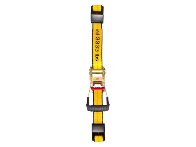The high visibility yellow strap is constructed of heavy-duty polyester webbing that resists stretching, tearing and rot. The burly steel flat hooks are rubber coated and won’t bend and offer added security when latched to equipment, trailers and vehicles. And the hardware is zinc coated to fend off corrosion.