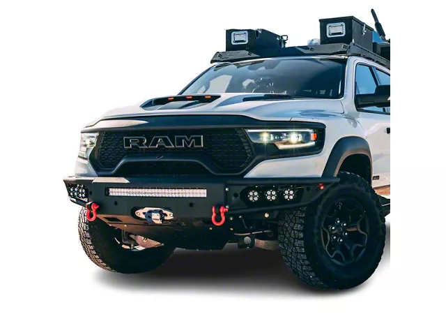 Heavy-Duty Bumper for Off-Road Protection. The Chassis Unlimited Diablo Series Bumper is designed for 2021-2025 Dodge RAM 1500 TRX models, offering robust protection and stylish design. This full-width front bumper features a textured black finish and is compatible with winches up to 12,000 pounds. With space for a 30-inch light bar and up to eight 3-inch cube lights, it enhances both visibility and functionality, making it ideal for off-road adventures.