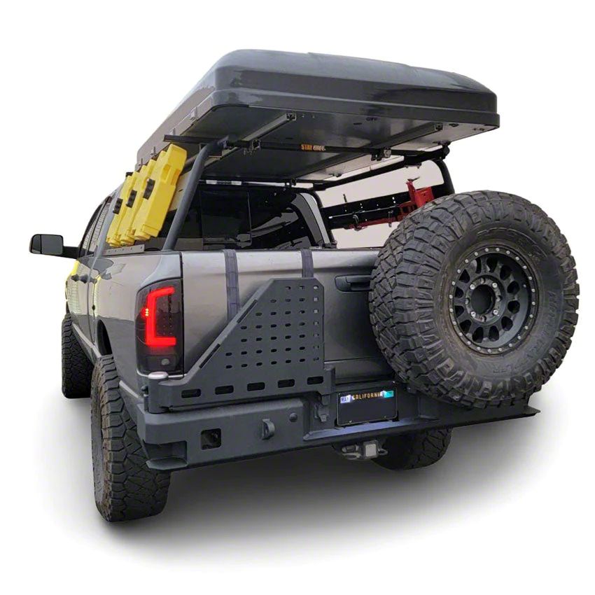 Loaded with Features. Looking for a high-quality rear bumper that offers both function and style? Check out the Chassis Unlimited Octane Series Dual Swing Rear Bumper. This bumper is designed to give your truck a rugged, off-road look while also providing protection and utility. The bumper includes a bolt-on spare tire mount, LED license plate lights, and integrated corner steps It also has recessed rear-facing mounts, making it perfect for attaching accessories like LED lights, spare tires, gas cans, and more.