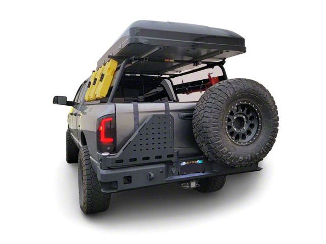 Loaded with Features. Looking for a high-quality rear bumper that offers both function and style? Check out the Chassis Unlimited Octane Series Dual Swing Rear Bumper. This bumper is designed to give your truck a rugged, off-road look while also providing protection and utility. The bumper includes a bolt-on spare tire mount, LED license plate lights, and integrated corner steps It also has recessed rear-facing mounts, making it perfect for attaching accessories like LED lights, spare tires, gas cans, and more.