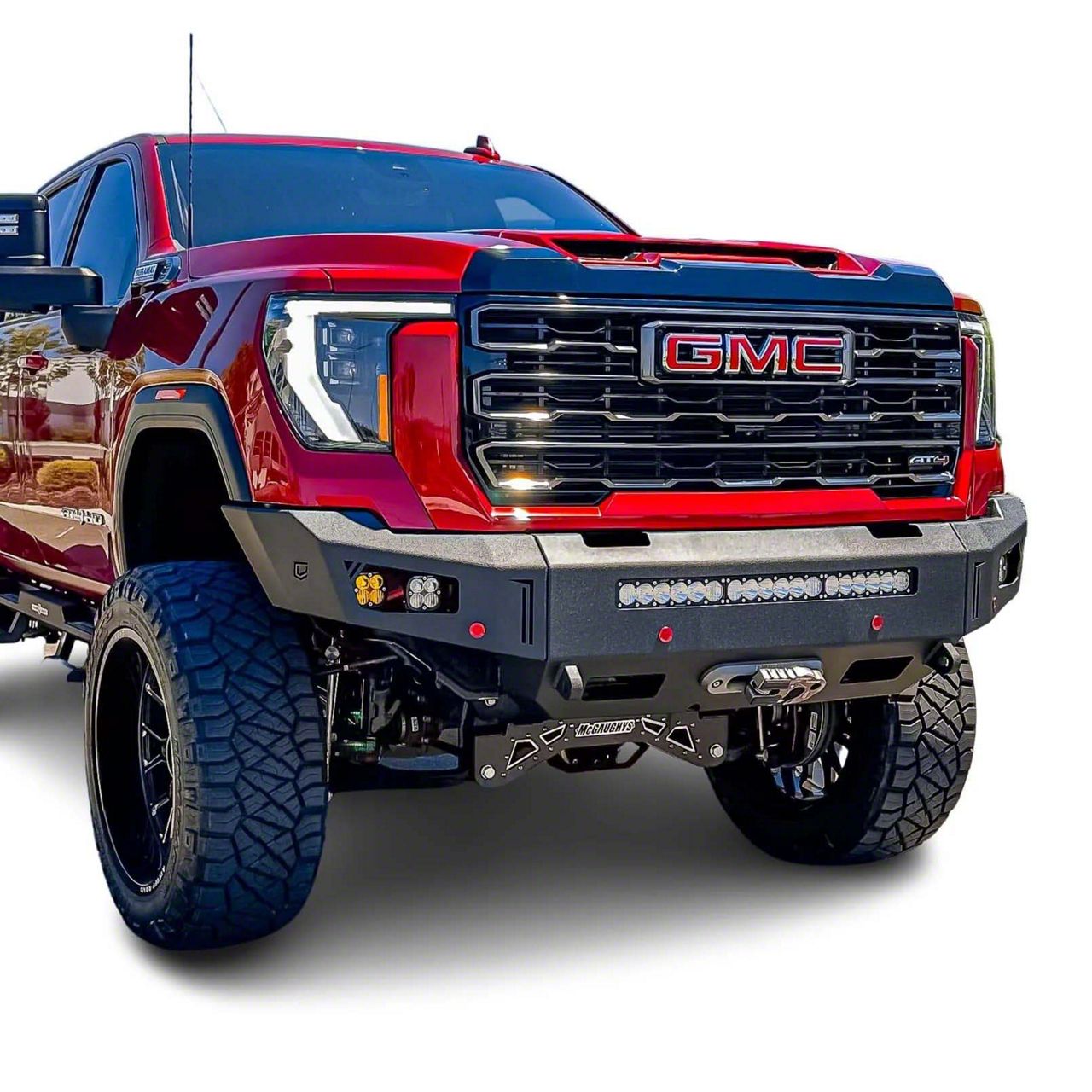 Rugged Front-End Protection. The Chassis Unlimited Octane Series Bumper provides robust protection and an aggressive look for your vehicle. This full-width front bumper is built from high-quality steel and features 1-inch-thick recovery points, making it compatible with winches up to 12,000 pounds. It is designed to enhance the functionality and appearance of your GMC Sierra 3500 HD with a rugged, low-profile design.