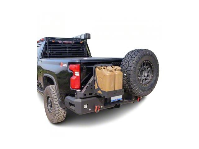 Chassis Unlimited Octane Series dual swing-out rear tire carrier bumper ships to your door ready to install on your truck, complete with a 3-Stage texture black powder coat. This is our direct bolt-on version, no cutting is required of your bed. Bumper Ships fully assembled ready to install.