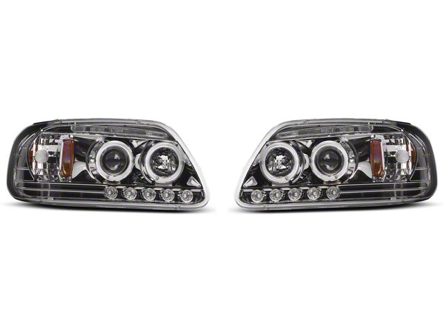 Custom Styling. Featuring a clean-looking chrome housing, built-in corner lights with amber reflectors, and a sparkling row of LED Daytime Running Lights, these Chrome LED Dual Halo Projector Headlights give your F-150 a fresh look. The halo rings provide an exciting, bold look known as "angel eyes." Draw envious glances and get better illumination with these headlights, which feature a 6 month warranty.