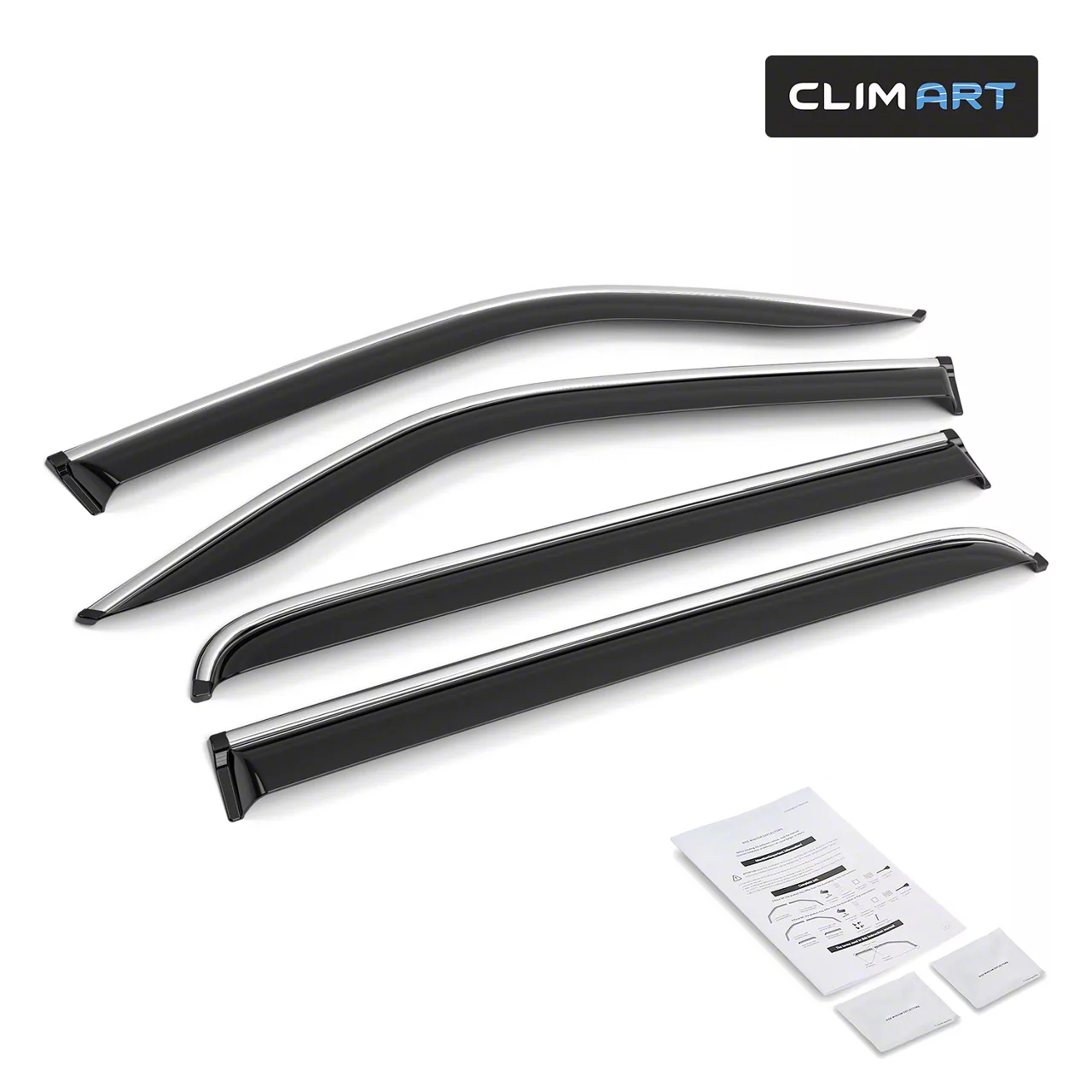 High Strength Quality. The Tape-On Window Deflectors are crafted with chrome trim, adding a touch of sophistication to your vehicle's exterior. Made from high-grade materials, they ensure exceptional durability and longevity, standing up to daily wear and tear. With a shatterproof design, these deflectors provide added protection and peace of mind. No matter the climate, these window deflectors are built to withstand harsh conditions, maintaining their performance and appearance.