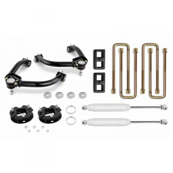 Confident Vehicle Stance. Give your Sierra a bold and proud stance with this Cognito Motorsports 3-Inch Standard Front Leveling Kit with Rear Shocks. This lift kit provides superfluous balance enhancement as well as an assured height gain of over 3-inches, making it possible to install larger tires for the off-road trails you plan to tread. The premium shocks and struts effectively inhibit vibration, reducing turbulence and promoting easier travels over rough roads.
