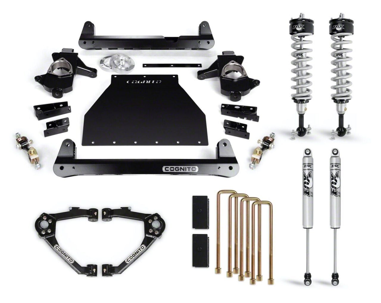 Impactful Metalwork. The Cognito 4-Inch Performance Suspension Lift Kit with FOX PS IFP Shocks utilizes powerful first-grade aluminum steel in the assembly of its components. From the very complicated performance shocks to the simplest bolt, each piece is anodized and electro-coated in zinc compounds and sprayed with black powder-coat paint to further fortify it against the elements, ensuring quality like no other.