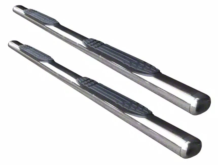 Construction and Appearance. Made from durable stainless steel, these Go Rhino 4-Inch 1000 Series Side Step Bars feature a polished finish that enhances the vehicle's look. They come with replaceable end caps, adding to their longevity and customization options.