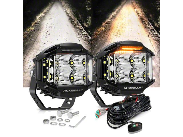 Safety and Style. Introducing our 4-Inch Round Side Shooter LED Pod Lights with Amber DRL (Combo Beam) - the ultimate lighting solution for all your off-road adventures. This pair of Side Shooter LED Pod Lights is designed to provide unparalleled visibility in any terrain. With dual side lights and a powerful front spot light, these pod lights offer superior nighttime illumination, ensuring you can conquer the darkest trails with confidence. These lights also feature an integrated Amber DRL (Daytime Running Light) and a Combo Beam pattern for enhanced visibility during the day and a focused beam for precision lighting at night.