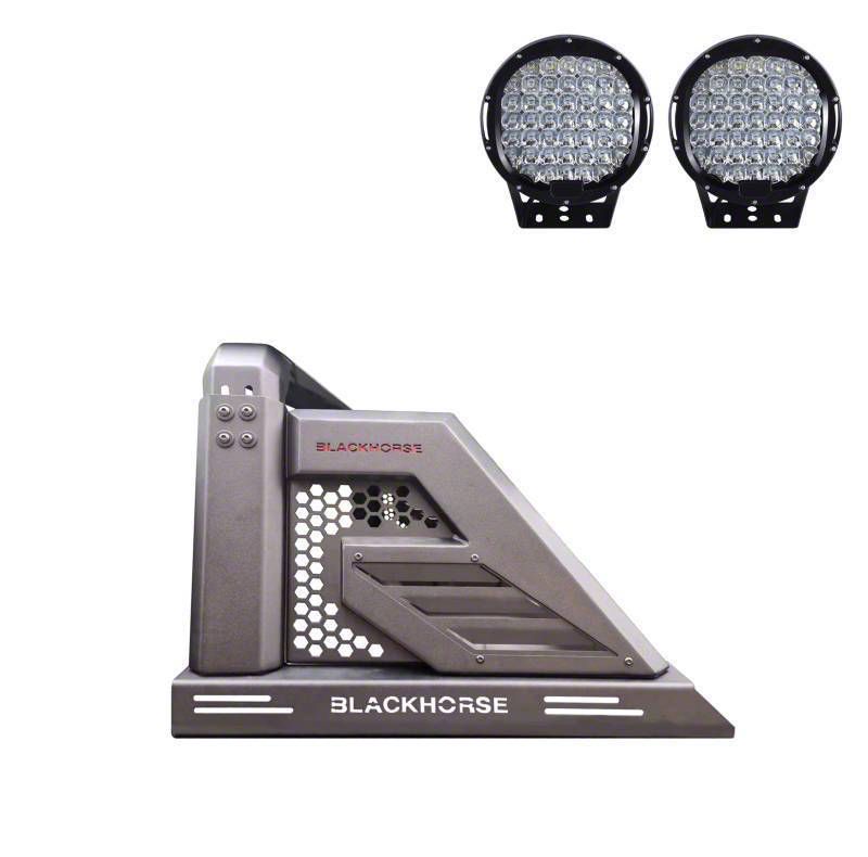 Rugged Roll Bar with LED Lights. The Armour II Roll Bar with 9-Inch Black Round Flood LED Lights and Basket offers enhanced utility and style for your vehicle. Developed with a patent-approved construction, this roll bar provides robust support and includes auxiliary lighting for improved visibility during off-road adventures.