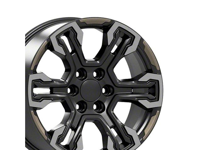 This 20x9 Store Brand CV65 Gloss Black Machined with Tan Accents 6-Lug Wheel; 20x9; 26mm Offset is completed in a high-quality gloss black finish with machined accents to make your wheel the envy of everyone. For added looks and durability, the wheels has a durable clear coat that withstand the rigors of daily driving.