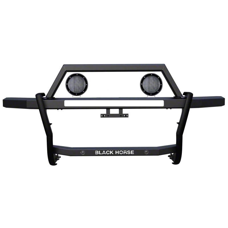 Construction and Appearance. Built from 4-gauge steel and finished in a matte sandy black powder coat, this grille guard is engineered to resist corrosion, impact, and harsh weather. It includes an integrated 30-inch LED light bar slot and four auxiliary mounting slots for added lighting flexibility. Rubber seals on the uprights help absorb minor impacts, and the modular design ensures easy access to the hood and headlights. A license plate relocation bracket is also included for compliance and convenience.