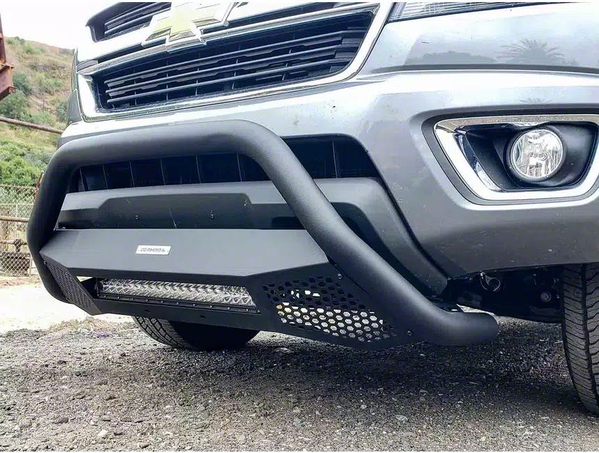 Robust All-Steel Front-End Protection. The Go Rhino RC4 LR Bull Bar with 20-Inch LED Light Bar provides superior front-end protection for your Chevrolet Colorado. Designed with a robust all-steel material, this bull bar ensures durability and strength, making it a reliable addition to your vehicle.