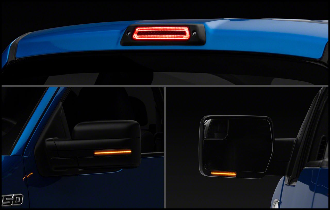 Rear Facing Side Mirror Sequential LED Turn Signals. Like the forward facing side markers above, these Rear Facing Side Mirror Sequential LED Turn Signals will improve the looks and safety of your 2004-2014 F-150 as well. These Lower Mirror Mounted Turn Signal Lights replace the weak stock lights with super bright, sequential amber LEDs for increased visibility, while the smoked lenses add an aggressive appearance.